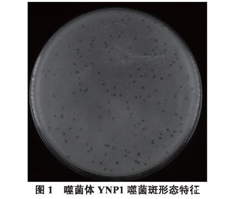 纯化的噬菌体经磷钨酸负染后,在120 kV透射电镜下观察其形态(图2)。噬菌体的头部呈二十面体立体对称,头部直径约100 nm,含有收缩性尾部,尾部的末端具有清晰的尾丝,并且暴露出尾管,尾部长约125 nm,宽约25 nm。根据2012年国际病毒分类委员会第9次报告提出的噬菌体分类与命名标准,该噬菌体符合肌尾噬菌体科特征,命名为vB_SauM_YNP1。
