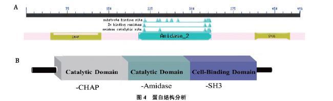 使用PHAST软件和NCBI BLAST软件对噬菌体全基因组序列进行分析,结果显示噬菌体YNP1基因组长度为143.5 kb,(G+C)%含量为30.80%,A、T、G、C含量分别为31.46%、37.74%、13.67%、17.14%,有205个开放阅读框(open reading frames, ORFs)。其中142个为假定蛋白(hypothetical protein)序列,对63个ORFs的同源性比较及功能预测分析,筛选到一个裂解酶基因,预测该基因表达的蛋白同时具有酰胺酶催化结构域和SH3b结合结构域(图4),命名为LysYNP1。通过对国内外已经发表的噬菌体编码裂解酶的结构和组成分析发现,具有酰胺酶催化域的裂解酶一般活性较高,而具有SH3b结合域的裂解酶一般会呈现相对较宽的裂解谱。同时在该噬菌体的全基因组序列中未发现潜在的毒力基因与整合酶基因,表明该噬菌体满足其作为治疗性噬菌体的前提要求。