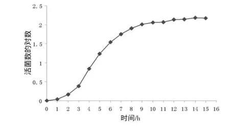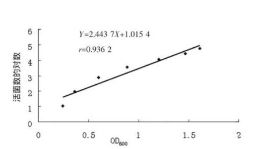 2.3血球计数板计数法与酶标仪OD600测定法的比较以OD600值为横坐标,血球计数板计数的自然对数为纵坐标,绘出对数生长期OD600与菌细胞数间函数关系的回归曲线,回归方程为:Y=2.443 7X+1.015 4,决定系数r=0.936 2,显著性检验结果:F=73.314,P=0.00<0.01,表明回归方程差异有统计学意义。见图5。通过Spearman秩相关计算OD600值和血球计数板计数的自然对数的相关系数为0.920,经秩相关系数的统计推断P<0.05,说明血球计数板计数法和酶标仪测定法相关性好。