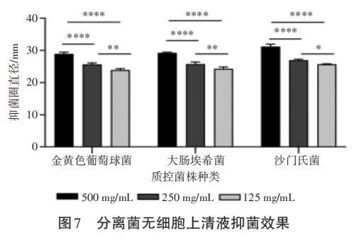 分离菌上清液的抑菌能力测定结果见图7。结果显示,G1上清液对于金黄色葡萄球菌,500mg/mL浓度组抑菌圈直径最大,为(28.90±0.52)mm,抑菌效果极显著强于250mg/mL和125mg/mL组(P<0.0001);对于大肠埃希氏菌和沙门氏菌,500mg/mL组抑菌效果均极其显著强于250mg/mL和125mg/mL浓度组(P<0.0001)。表明G1对3种质控菌的抑菌效果均表现出显著的浓度依赖性,且随着上清液浓度的升高,抑菌作用显著增强。