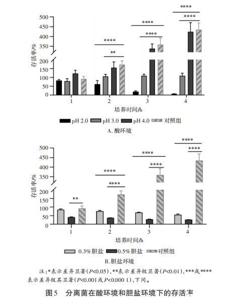 图5 分离菌在酸环境和胆盐环境下的存活率