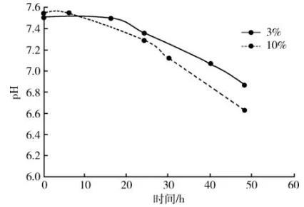 生长曲线两种接种浓度猪鼻支原体生长曲线见图1和图2。从图1可以看出,以3%浓度接种,猪鼻支原体在0~48 h活菌浓度平稳上升,生长速率逐渐升高。以10%浓度接种,猪鼻支原体在0~48 h活菌浓度持续上升,0~6 h为迟缓期,6~48 h为对数期,其中24~30 h生长速率最快。从图2可以看出,0~48 h内,两种浓度接种菌液pH值变化范围和趋势大致相同,变化范围为6.63~7.55。3%浓度接种,0~16 h内,pH值下降平缓,16~48 h pH值下降速度较快。10%浓度接种,0~6 h内,pH值下降平缓,6~48 h pH值下降速度较快,且10%比3%pH值下降更快。