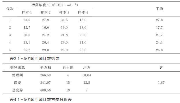 1~5代菌活菌计数结果活菌计数结果见表3。各代次间活菌浓度进行差异分析结果见表4,F=1.67
