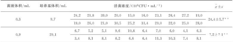 不同传代体积差异比较从表5可以看出两种传代体积猪鼻支原体不同生长情况,“0.3 mL菌液加入9.7 mL培养基”这种体积构成的传代方式下,20组菌液浓度平均值为24.4×108CFU/mL,标准差5.7;“0.9 mL菌液加入29.1 mL培养基”这种体积构成的传代方式下,20组菌液浓度平均值为7.2×108CFU/mL,标准差2.1;用双样本异方差假设下t检验对这两组实验数据进行分析,两种传代方式下活菌浓度之间差异极显著。