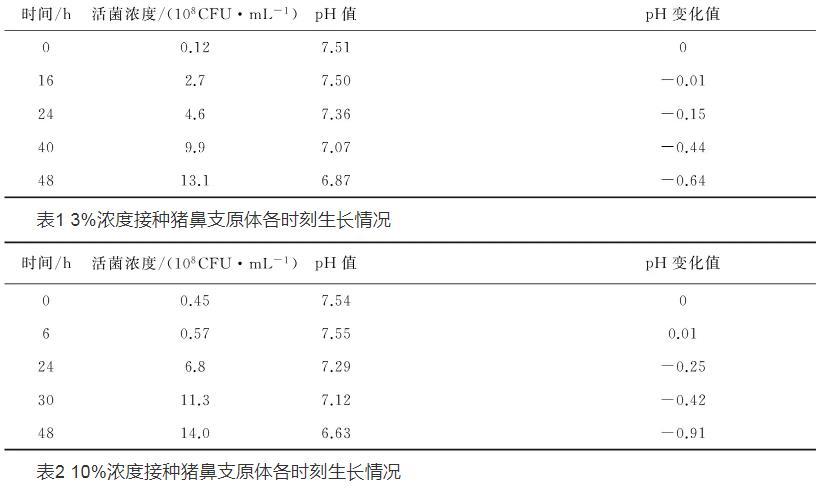 本试验通过活菌计数和pH值测定,首次确定了猪鼻支原体适宜传代比例、收获时间、菌种代次以及传代体积。