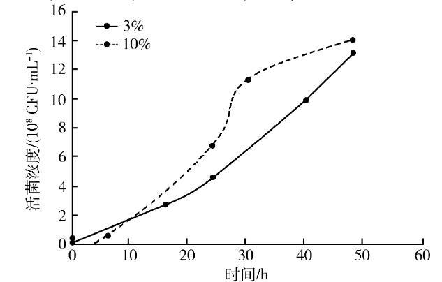 不同接种浓度活菌浓度和pH值的比较两种浓度接种的猪鼻支原体各时间点的活菌浓度和pH值如表1和表2所示。从表1可以看出,3%浓度接种的猪鼻支原体0~48 h活菌浓度持续上升,到48 h达到峰值13.1×108CFU/mL,菌液pH值则持续下降,在40~48 h之间某时刻降至7.0以下。从表2可以看出,10%浓度接种的猪鼻支原体0~48 h活菌浓度持续上升,到48 h达到峰值14.0×108CFU/mL,菌液pH值则持续下降,在30~48 h之间某时刻降至7.0以下。