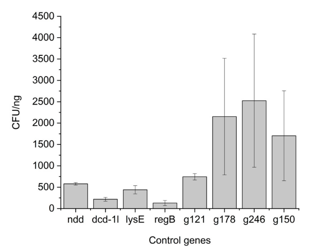 图1、已知有毒和无毒基因的混合物转化效率的差异。柱状图显示了两个不同基因复制的样品的CFU/ng值的平均值。