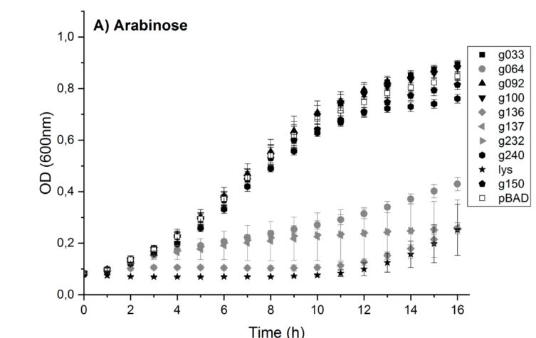 图3、在阿拉伯糖诱导启动子pBAD30控制下表达噬菌体蛋白的重组大肠杆菌在最小培养基M9t中添加了阿拉伯糖(A)或葡萄糖(B)基因表达及基因抑制的大肠杆菌生长曲线图。