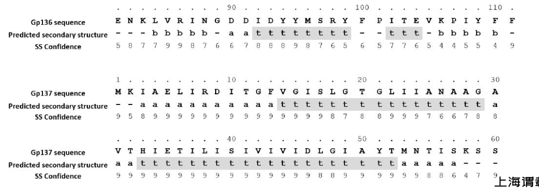图5、预测Gp136和Gp137的跨膜螺旋序列。a-α螺旋,b-β螺旋,t-TM螺旋。数字0-9表示Phyre2对二级结构预测的置信度。