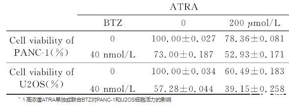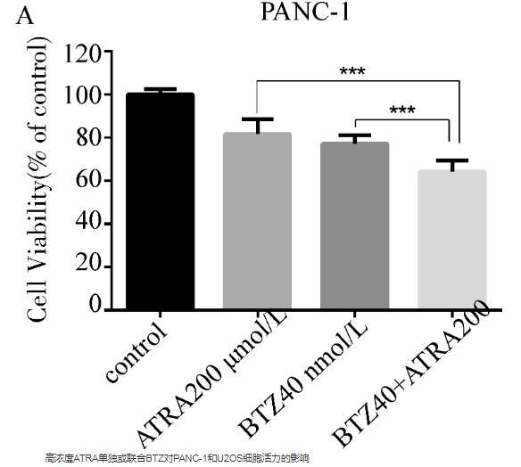为进一步检测BTZ对ATRA作用的影响,我们继续进行了高浓度ATRA联合BTZ的用药实验。采用200μmol/L ATRA和40 nmol/L BTZ单独或联合处理PANC-1或U2OS细胞24 h,MTS实验检测细胞活力。结果显示,高浓度的ATRA可以显著抑制PANC-1和U2OS细胞的生长(P<0.001),联合应用ATRA和BTZ可明显抑制PANC-1和U2OS细胞的生长(P<0.001)(图2,表2),与单独应用ATRA相比,联合用药组都具有显著差异(PANC-1,P<0.001;U2OS,P<0.01);与单独应用BTZ相比,联合用药同样具有显著差异(P<0.01)(图2)。