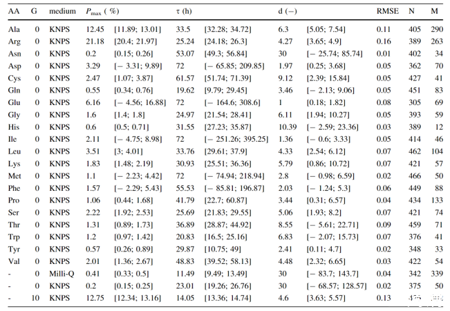 图2、非对称模型的参数估计,用于描述娄地青霉菌芽管形成的芽管存在10mM葡萄糖(G)或10mM的蛋白质源氨基酸(AA)之一的存在。
