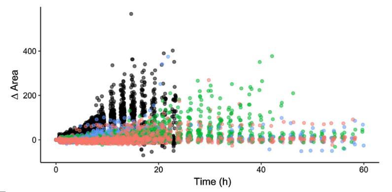 图3、随着时间的推移,在KNPS+精氨酸(红色)、丙氨酸(绿色)或葡萄糖(蓝色)中培养的娄地青霉菌的单个发芽分生孢子的像素中的Δ面积(面积t=x-面积t=1)。黑点显示NPS+丙氨酸中正在发芽的A.niger分生孢子。