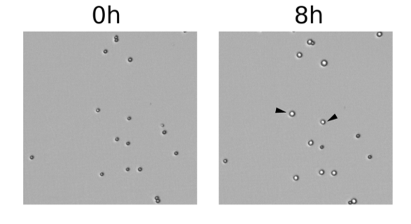 图5、干酪乳杆菌分生孢子在麦芽提取物肉汤中的肿胀示意图。箭头表示肿胀的分生孢子。
