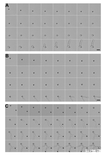 图4、用oCelloScope(标尺,15μm)检测娄地青霉菌在KNPS+丙氨酸(a)、精氨酸(B)和葡萄糖(C)中的萌发情况。沉降1小时后开始成像,间隔1小时(1-23小时)和2小时(23-41小时)。