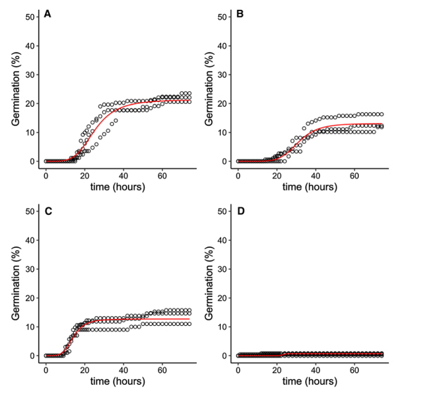 图1、用于描述青霉菌属分生孢子在KNPS(6.71 mM KCl、70.6 mM NaNO3、11 mM Na2 HPO4/NaH2PO 4(pH 6.0)、2 mM MgSO 4)中形成胚芽管的不对称模型,辅以10 mM精氨酸(A)、丙氨酸(B)、葡萄糖(C)、Milli-Q(D)作为对照。心点代表两次技术重复的平均值。