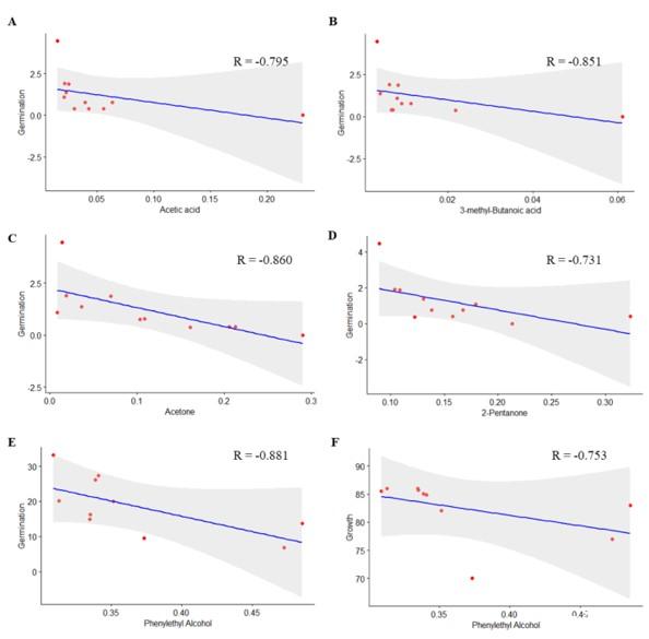图4、化合物的相对发芽率或菌丝生长速率与相对峰面积之间的spearman相关系数散点图。(A)y轴:罗氏白僵菌发芽率;x轴:乙酸峰面积;(B)y轴:罗氏白僵菌发芽率;x轴:3-甲基丁酸的峰面积;(C)y轴:逆色芽萌发率;x轴:丙酮峰面积;(D)y轴:逆色芽孢杆菌的发芽率;x轴:2-戊烷的峰面积;(E)y轴:逆色芽孢杆菌的萌发率;x轴:2-苯乙醇的峰面积;(F)y轴:逆色偃麦草菌丝生长速率;x轴:2-苯乙醇的峰面积。