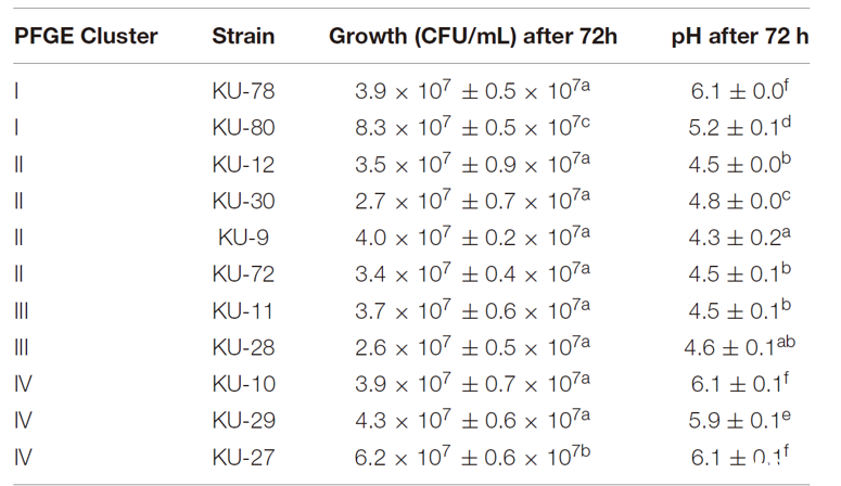 图1、在25°C下接种72小时后,添加4%(w/v)NaCl的MYGP肉汤的生长和D.hansenii菌株的pH变化。