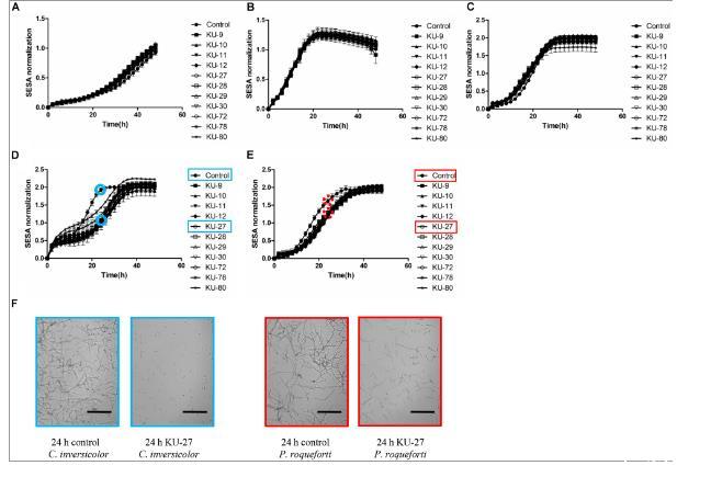 图2、来自D.hansenii菌株KU-9、KU-10、KU-11、KU-12、KU-27、KU-28、KU-29、KU-30、KU-72、KU-78和KU-80对使用oCelloScope TM测量为标准化SESA单位的五种霉菌的生长情况。(A)Cladosporium sinuosum,(B)镰刀菌,(C)毛霉菌,(D)Cladosporium inversicolor,(E)Penicillium roqueforti。每个点代表三个独立实验的平均值,误差条代表标准偏差。(F)oCelloScope监测C.inversicolor(蓝色)和P.roqueforti(红色)在酵母蛋白胨培养基(对照)中或在D.hansenii菌株KU-27的无细胞上清液存在下24小时的生长测量实时图像。这些研究结果表明D.hansenii无细胞上清液主要以霉菌物种依赖性方式影响萌发阶段,而不是以D.hansenii菌株依赖性方式。