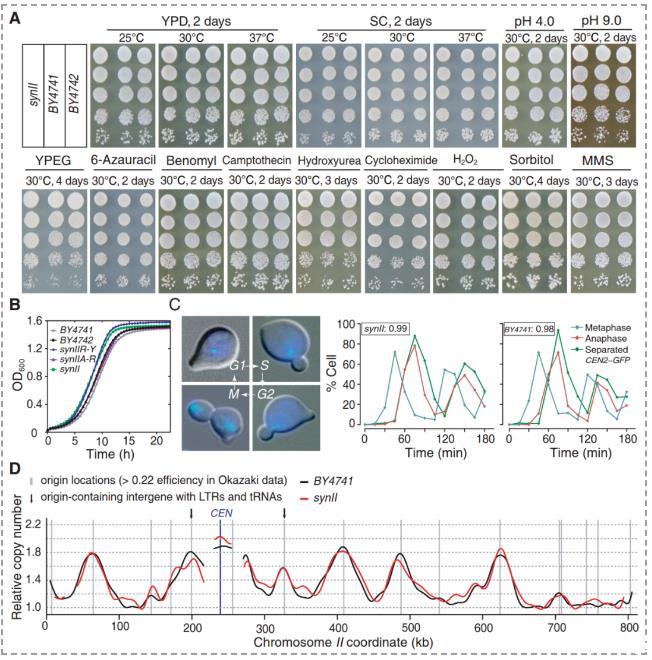 图2、synII染色体的表型分析。图A表示的是synII在不同介质上的表型测试。图B表示的是synIIA-R,synIIR-Y的生长曲线图以及synII菌株与BY4741和BY4742菌株生长曲线对比图。图C表示的是synII与BY4741菌株的细胞周期比较图。图像显示了细胞在不同阶段的细胞形态。图D显示synII细胞与分离的CEN2-GFP点(中期)的百分比。在细胞周期中纺锤波和后期纺锤波。每一个时间点至少计算了200个细胞,表示的是synII和BY4741菌株中期到后期细胞的总比。图D表示的是SynII(红色)和BY4741(black)复制时间表示,所得的数据通过深度测序的相对拷贝数计算。