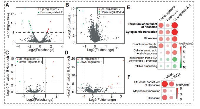 图3、synll染色体贯穿组学剖面分析(BY4741作为对比参照物)设计对细胞生理学的影响很小,只表现为适度的上调。其中trna采用的是去除触发的转译机制(A到D)。如图显示,图A表示的是synII细胞的转录组水平、(B)synII细胞的蛋白组水平、(C和D)synII细胞的代谢组与BY4741细胞对比。在转录组、蛋白质组和代谢组中,差异表达的总数量(P<0.001)也呈现出来,图中对应上调和下调的特征分别用红色和绿色标注。图(E)表示的是通过转录组和蛋白质组在酵母菌中表达的富集途径和表达剖面图,上调的特征用红色标注,下调的特征用绿色标注。图(F)表示的对synII的RNAseq分析和无tRNA序列的基因序列分析。通过添加synII染色体的tRNA阵列。对于(E)和(F)其显著性水平由热图颜色强度和符号大小表示。上调和下调的功能以红色和绿色标注。