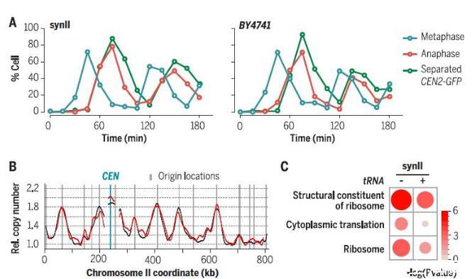 图1、synII和BY4741的细胞周期对比显示的百分比。带有分离的CEN2-GFP点、中期纺锤波和后期纺锤波的细胞。(B)复制配置synII(红色)和BY4741(black)通过深度基因测序显示的相对拷贝数。(C)RNA序列分析表明,synII中转译机械的显著上调是由synII中tRNA基因的缺失引起的。