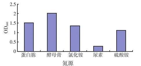 以甘油为碳源,磷酸氢二钾为磷源,加入1.0 ml/l微量元素溶液,1.0 ml/l维生素溶液,再分别加入蛋白胨、酵母膏、氯化铵、尿素、硫酸铵为唯一氮源配制培养基,接种沼泽红假单胞菌R1培养7 d后,试验结果见图2。由图2可知,沼泽红假单胞菌R1较适宜的氮源为酵母膏,其次为蛋白胨,但考虑到酵母膏、蛋白胨使生产成本高,营养丰富易造成染菌等因素,因此本试验选择氯化铵为氮源。