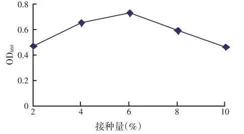沼泽红假单胞菌R1分别按照体积比的2%、4%、6%、8%、10%接入液体菌种于优化后的培养基200 ml中,于30℃、40 W白炽灯距离20 cm处下静置培养72 h,结果见图3。由图3可知,随着接种量的增加,沼泽红假单胞菌R1菌数OD660值不断增加,当接种量为6%时达到最大值,再加大接种量则OD660值呈现逐步下降趋势,分析原因可能为随着接入沼泽红假单胞菌菌数的增加造成培养基营养的匮乏造成的,其适宜的接种量为6%(V/V)。
