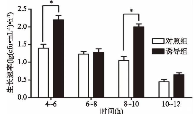 本研究中,通过升高温度抑制菌体cspcmRNA基因的表达,结果如图4所示,在接种后生长第4和8 h,菌体经43℃、30 min诱导,菌体cspcmRNA基因的表达明显降低,而随着温度降至37℃,cspcmRNA基因的表达又恢复到原来水平。如图5所示,经过诱导后的鼠李糖乳杆菌生长明显加快,且活菌数明显升高。如图6所示,经过两次诱导后,与对照组相比,诱导组4~6 h以及8~10 h的生长速率明显增高,差异显著(p<0.05),而6~8 h和10~12 h两组的生长速率差异不显著。