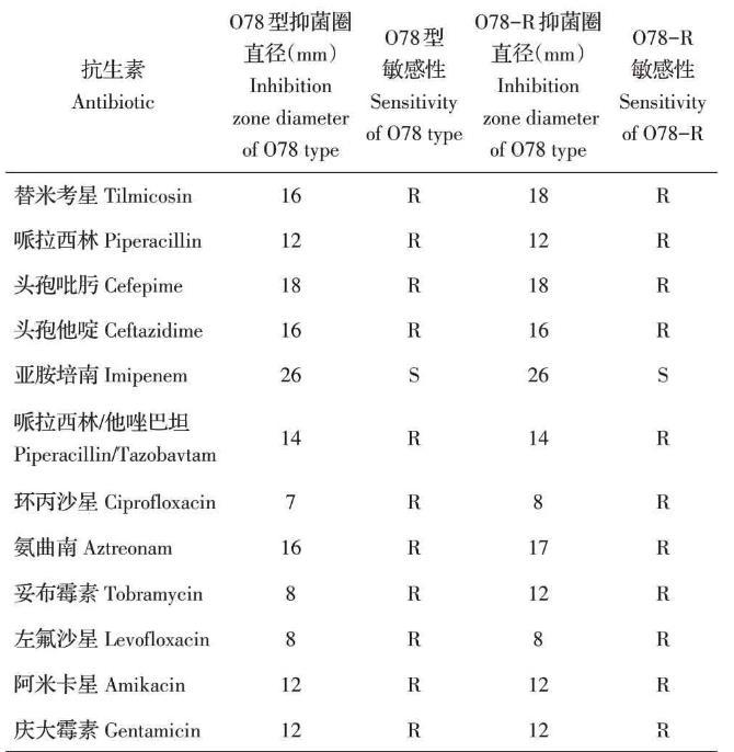 采用玻板凝集法对O78型敏感菌株及O78-R抗性菌株进行血清型鉴定,结果显示,O78型敏感菌株与O78抗血清呈明显的凝集现象,液滴边缘出现麸皮样颗粒状的凝集片,液体清亮;O78-R抗性菌株与O78抗血清的凝集现象不明显,液体浑浊,且有少量细微颗粒。表明敏感菌株确为O78血清型,而抗性菌株血清型发生了改变,已不能鉴定为O78血清型。
