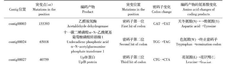将敏感菌株与抗性菌株分别测序。结果显示,O78型敏感菌株与O78-R抗性菌株基因组全长均为4 798 435 bp。两组测序数据的比对分析结果显示,抗性菌株中有3个碱基发生突变,分别位于3个重叠群(contig)中(表1)。