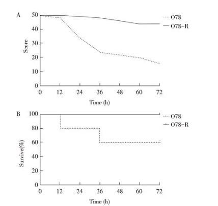 将敏感菌株与抗性菌株的增殖液经腹腔接种小鼠,记录小鼠的体况计分及存活率。结果显示,抗性菌株接种的小鼠未出现死亡,在感染后0~48 h小鼠体况计分一直维持在45分以上,之后略有下降(图4A);而敏感菌株接种的小鼠在接种后72 h内共死亡4只,体况计分比抗性菌株接种的小鼠约低30分(图4B),表明噬菌体抗性菌株对小鼠的致病性降低。