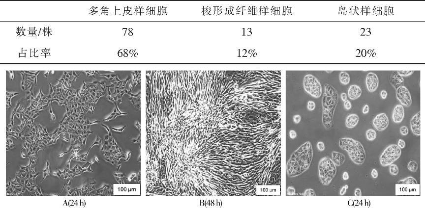 A.多角上皮样细胞(×100);B.梭形成纤维样细胞(×100);C.岛状样细胞(×100)