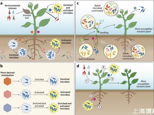图2植物对微生物的选择性调控。(a)植物如何选择性地招募和抑制微生物群落及影响其活性的机制概览。箭头和线条的粗细代表支持或抑制的不同强度。(b)微生物利用植物来源的代谢物质,导致它们的富集和激活,从而促进功能性反应。(c)在生长阶段,宿主植物持续塑造其微生物群,组建一个稳定的微生物群落,这使得植物更易受感染或更具抵抗力。(d)在受到压力时,宿主植物招募并激活特定的微生物,这可能有助于防御,或者在环境阈值超过植物调控能力的情况下,无意中促进病原体感染或加速植物死亡