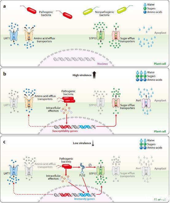 图1.通过共享资源调控细菌行为。(a)植物向胞间隙分泌/释放共享资源(例如,糖类、氨基酸和水),从而帮助病原性和非病原性细菌的定植。(b)病原体通过激活宿主的糖类和氨基酸外流转运蛋白以及将效应子AvrE作为水透性通道导入宿主跨膜,增加胞间隙中共享资源的量,从而表现其致病力。(c)当病原体展示其致病力时,宿主植物通过模式触发免疫和/或效应因子触发免疫诱导其免疫反应,进而激活诸如STP13和LHT1等内流转运蛋白,以减少胞间隙中的共享资源量。这导致病原体的致病力和生长受到抑制。实线表示已建立的连接。虚线表示假设/潜在的关联?;疑淖说鞍孜醇せ?。箭头和线条的粗细代表支持或抑制的不同强度。