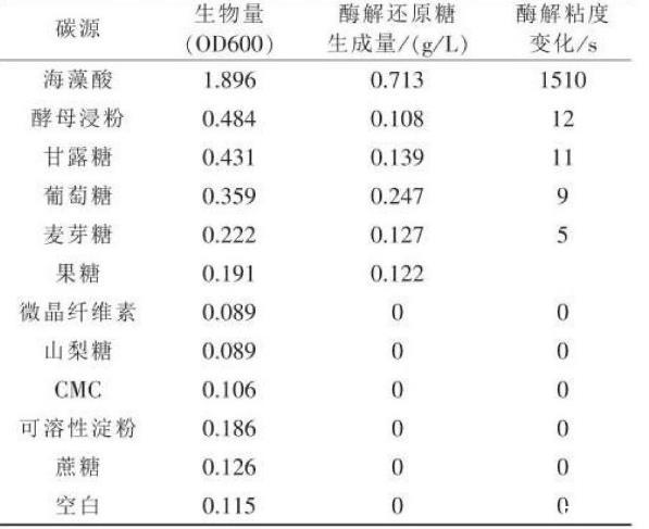 1.2.1不同碳源对生长和产酶的影响在基础培养基的基础上调整碳源,即分别添加浓度均为0.6%的葡萄糖、麦芽糖、蔗糖、可溶性淀粉、海藻酸、微晶纤维素、果糖、甘露糖和山梨糖,配制含有不同含碳化合物的培养基。然后按3%的接种量接入菌液,于30℃液体培养16 h后,测定发酵液的生物量和上清液的酶活力。