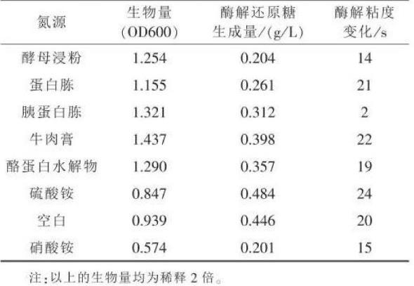 不同氮源对AGN12菌生长及产酶的影响见表2。