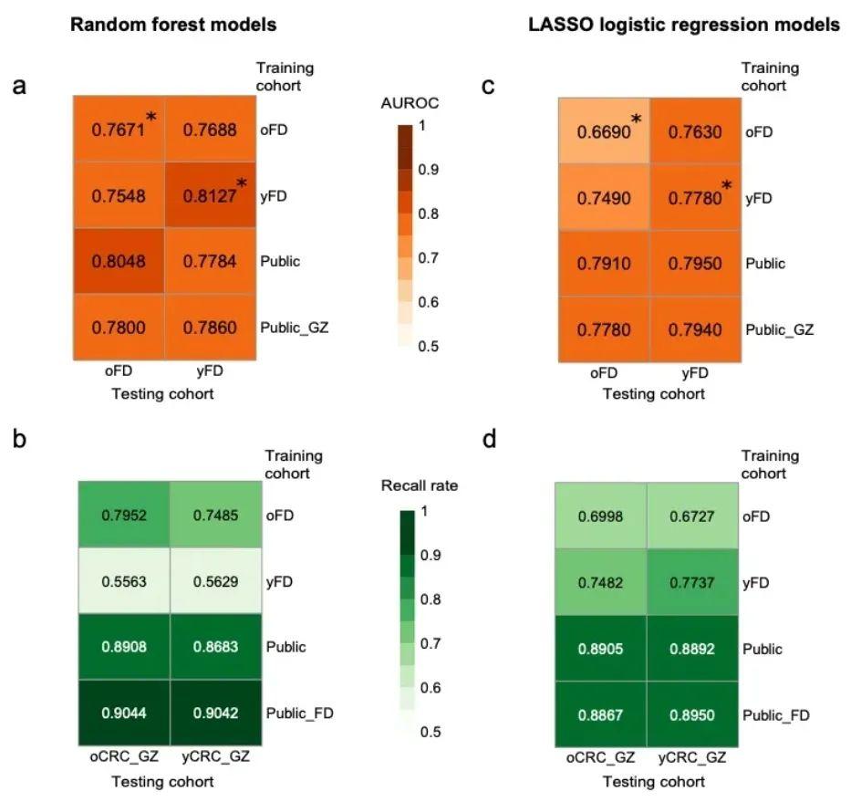 最后,研究者整合本中心以及其他公开的结直肠癌粪便宏基因组数据,总共1922份标本,使用机器学习方法分别构建针对年轻和年老肠癌的分类器,并验证分类效果?;诓煌盗费炯姆掷嗥?,对年轻肠癌和老年肠癌都具有优秀的预测效果。这一发现进一步突显了粪便微生物在结直肠癌(尤其是年轻肠癌)筛查中的巨大潜力。