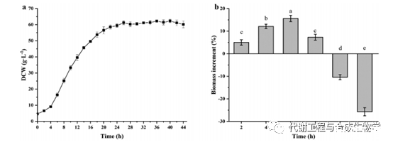 谷氨酸棒状杆菌的生长曲线如图a所示,作为识别不同生长期的基线数据。培养前4h为延滞期,培养后4h至20h为指数期,培养20h后进入稳定期。在进行发酵的同时应用超声波对发酵液进行处理,超声波处理时长分别为2、4、8、16、20和24h,超声波处理对谷氨酸棒状杆菌不同生长阶段的影响如图b所示。在滞后期和指数期开始时,生物量显著增加,在8h时,超声波处理的谷氨酸棒状杆菌的生长比对照增加了15.6%。超声处理在指数后期和稳定期会导致生物量显著下降。超声波对微生物有双重作用:对细胞生长的积极影响是可以提高酶的活性和营养物质的传质速率,而消极影响是应用超声波所产生的剪切力和自由基。不同生长阶段的细胞对超声波的耐受性不同。因此,后续实验选择以8h为指标进行超声处理。