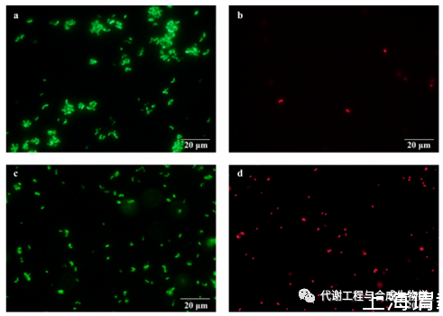 为了确定超声处理是否影响谷氨酸棒状杆菌细胞膜的完整性,我们结合荧光显微镜使用了活性染色来进行观察。应用PI和SYTO9双染时,细胞膜完整的细胞显示绿色荧光,而受损的细胞膜允许PI流入,导致呈现红色荧光。如图所示,与未处理的对照组相比,超声下发出绿色荧光的细胞数量减少,而发出红色荧光的细胞数量增加。这说明超声波处理对谷氨酸棒状杆菌的细胞膜造成了一定程度的损伤。膜通透性的增加也会导致L-亮氨酸的胞内外排,从而减缓L-亮氨酸生物合成途径中关键基因的转录衰减和关键酶的反馈抑制。这是超声提高L-亮氨酸产量的原因之一。此外,稳定的微泡振荡还会导致H2O2和其其他活性氧的产生,进一步使脂质和膜蛋白过氧化。脂质和膜蛋白过氧化可能是膜通透性增加的原因之一。膜渗透性增强的另一个可能原因是空化,这直接导致了超声处理产生的力学效应。超声在物理和化学层面上都能增加细胞膜的通透性。