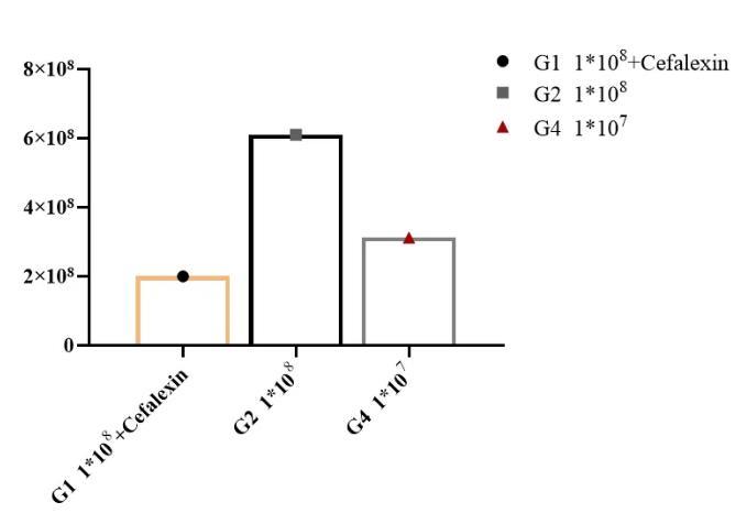 小鼠肺脏组织细菌载量随着接种量的增加而增加,G4组肺组织细菌载量为3.12*108,G2组细菌载量为6.1*108。给与头孢氨苄治疗后细菌载量明显下降,G1组细菌载量为2*108(图4)。