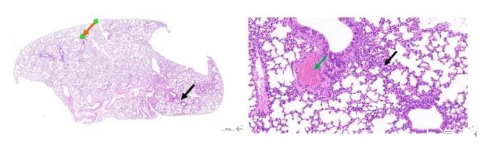 肺脏组织的被膜结构清晰;肺脏实质为肺内支气管各级分支及其终末的大量肺泡,灶性肺泡壁轻度增厚(黑色箭头),肺泡间隔增宽;各级支气管结构无明显异常;少量血管周围结缔组织排列疏松(橙色箭头);少量血管淤血(绿色箭头);未见明显的炎性细胞浸润。