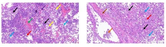 肺脏组织的被膜结构清晰;肺泡壁薄,大范围肺泡上皮细胞坏死(黑色箭头),胞核溶解,胞质嗜酸性增强;肺泡腔内广泛可见以巨噬细胞、淋巴细胞及粒细胞为主的炎性细胞渗出(蓝色箭头),并可见坏死细胞碎片及少量嗜酸性物散在分布(红色箭头),少量肺泡扩张(灰色箭头),体积增大;大量支气管及细支气管腔内可见炎性细胞渗出及坏死细胞碎片(橙色箭头);此外,细支气管及肺泡腔内可见大量的蓝紫色点状物细菌聚集(黄色箭头);组织内可见大量的出血灶(棕色箭头),肺泡腔、细支气管及血管周围可见多量的红细胞;多见肺泡壁毛细血管淤血(紫色箭头);少量血管淤血(绿色箭头)。