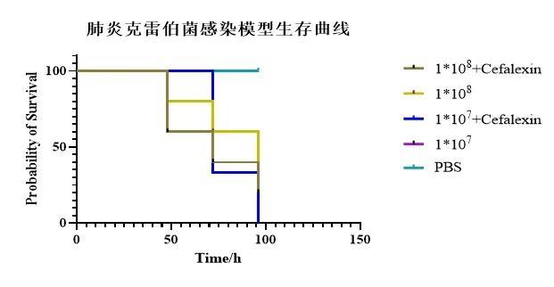 肺炎克雷伯菌小鼠LD50为6.9*106 CFU/只,滴鼻攻毒后D2-D3小鼠症状最明显,体重下降严重,陆续出现死亡,小鼠经过头孢氨苄治疗后状况优于未治疗组;由于菌株毒力较强,攻毒低剂量组存活率高于高剂量组。