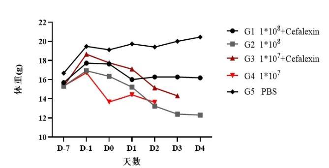 肺炎克雷伯菌LD50为6.9*106 CFU/只,滴鼻攻毒后D2-D3小鼠症状最明显,体重下降严重,陆续出现死亡,小鼠经过头孢氨苄治疗后状况优于未治疗组;由于菌株毒力较强,攻毒低剂量组存活率高于高剂量组。