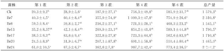 测定不同菌液对扁穗雀麦产量的促生效果发现菌液的促生效应主要表现在植物生长早期,尽管每个菌株都有促生效果,但增加幅度与持续时间差异较大。第1茬与第2茬测产时,除Br13与Br20外,所有的菌液都对产量有显著促进作用(P<0.05),第3茬测产时发现只有施用Br7,Br17与Br24的植株产量显著高于对照(P<0.05),Br8,Br13与Br20差异不显著。第4茬与第5茬产量测定表明只有Br7与Br24两种菌液对植物促生达显著水平(P<0.05),然而其促生的增产幅度也比前3茬降低,其余菌液对植物促生效果与对照差异不显著。5茬草总产量比较发现,Br24与Br7对产量促进效果最好,Br13和Br17次之,而Br8与Br20对产量促进作用不明显(表4)。