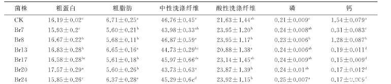 根据施用菌液的差异将每个处理下5次刈割的扁穗雀麦牧草混合均匀,测定其营养品质的变化。粗蛋白是决定牧草营养品质的重要指标之一,不同溶磷菌液对扁穗雀麦粗蛋白含量影响较大,其中Br13与Br20显著高于对照(P<0.05),Br8与Br17与对照相当,Br7与Br24略低于CK,但他们与对照间均没有达到差异显著水平(P>0.05)。施用溶磷菌液使扁穗雀麦粗脂肪的含量有下降的趋势,Br7、Br8、Br17与Br20与对照相比,粗脂肪含量下降16%(P<0.05),Br13与Br20没有显著变化(P>0.05)。中性洗涤纤维与酸性洗涤纤维是衡量牧草营养价值的重要指标,并与动物采食量以及消化率显著相关。除Br8与Br17菌株外,施用其余菌液均能显著降低扁穗雀麦的中性洗涤含量(P<0.05),但有增加酸性洗涤纤维含量的趋势,除了施用Br13菌液比对照略低外,其余各菌液都不同程度提高了扁穗雀麦酸性洗涤纤维的含量,但都未达到差异显著(P>0.05)。使用溶磷菌液以后,扁穗雀麦的含磷量比对照高9.52%~19.05%(P<0.05)。然而施用溶磷菌液显著降低了扁穗雀麦植株钙含量,除Br8以外,其余各菌液降低值>70%(表5)。