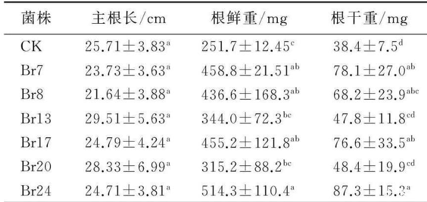 相对于各溶磷菌对株高的显著促生作用,其对根系的促进效果较弱。接种不同溶磷菌菌液的扁穗雀麦的根系长度与对照差异不显著(表2)。但植物根系的重量均比对照有增加趋势,除Br13与Br20外,其他处理均显著高于对照(P<0.05),其中,Br24,Br7和Br17促生效果最好(P<0.01)。干重的变化趋势与鲜重相同,Br3与Br20与对照差异不显著(P>0.05),Br24、Br7、Br17与Br8均显著高于对照(P<0.05)。