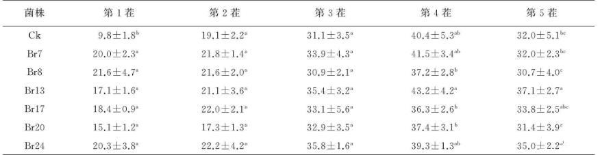 株高与分蘖数是禾本科牧草产量的两个决定性因素,试验中施加不同菌液对扁穗雀麦分蘖数发现,菌液能不同程度促进植株的分蘖,其中施用Br7与Br24菌液的植株分蘖数比CK增加69%~73%(P<0.05),Br8、Br13、Br17与Br20对植株分蘖的促进效果相对较弱,施用后尽管分蘖数增加,但与对照差异不显著(P>0.05,图1)。