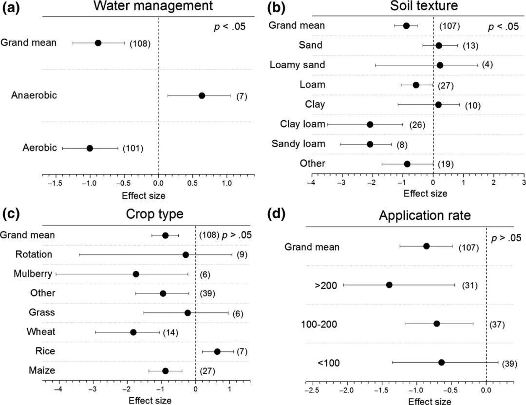 图4分别使用(a)水分管理,(b)土壤质地,(c)作物类型和(d)施氮量(kg N/ha)分组数据进行分析时长期施氮对土壤细菌多样性的影响