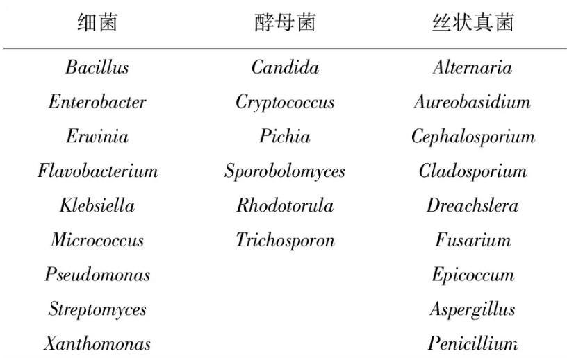 麦汁中的微生物主要来源于麦田、储存过程和麦汁加工过程,包括植物品种、气候、土壤、储存和运输等都会影响大麦和麦汁中的微生物种类。Fusariumgraminearum和F.culmorum产霉菌毒素在酿造过程中无法剔除或降解,会留存在成品啤酒中。大麦中的微生物群落因收获后管理措施的不同而有很大差异,大麦表面的微生物通过形成致密的生物膜,能提高对干燥、加热和抗生素等的耐性。表1列出了收获后大麦中常见的微生物种类。